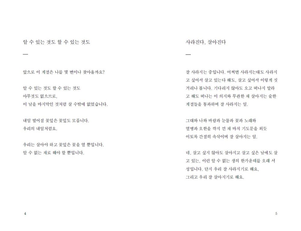 알 수 있는 것도 할 수 있는 것도 / 사라진다, 살아진다 / 장 면 / 쓴다는 것 / Von der Blumen / 꿈 / 꽃으로 태어나자 / 최선을 다해, 봄 /봄의 언어 /시 / Hoerst du gar nicht, was ich schreie?/ Innere Augen / 나뭇잎 / 재배 / 보이지 않아 도 보이는 / 잡초 / 악 / 홀로 / 바람 간 자리에 마음이 불어 요 / Meine kleine Garten / Trotzdem / 꽃들은 좋겠다 / 있었 다 / 꽃의 얼굴을 보았다 / 슬픔은 나의 편 / 흔들린다 / 하루 의 끝자락에서 / 유감 / 슬픔이 지 나간 자리 / 죽기 좋은 계 절 / 부재에게 / 그대도 있었다 / Die Geliebte der Nacht / 매 일, 밤 / 좋아합니다 / 오늘 / 꽃을 앓았다 / 일요일 / 아직 여 기 / 꽃잎처럼 / 안부 / 어떤 눈 / 거리 / 동의 / 심장도 없이 / 한갖 / 모든 살아 움직이는 것들 / 이름들 / 햇빚 탓 / 낙원 / 무대 / 처방전 / 고요 / 개화 / 살아있는 동안 / Ein Traum in der Sommer-Nacht / 우리 여기에서 / 사실 / Vor dem Aufbluehen / 다짐 / 단지, 시간이 아프다 / Das Ende des Tages / 노크하는 기억 / 모든 것은 슬프고 아름답다 / 성공 / 그런 사람 / 업무 / 나가며