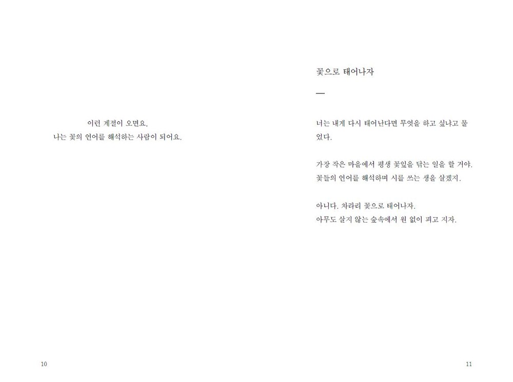 사라지고 또 살아질 수밖에 없는 삶, 살아 있는 모든 생명의 꿈틀거림. 지친 현실에서 돌아와 매일 산책을 하며 자연 속 에서 위안을 받는 작가는 길을 거닐며 스치는 단상, 꽃과 나 무, 바람 그리고 계절의 언어를 옮겨 적는 일을 한다. 인간도 나무도 아닌 그 사이, 무소속의 고독한 사유의 보폭 속에서 무엇을 보고 무엇을 들었는지, 계속하여 자문한다." 작가는 세상의 소리를 해석하는 번역가이다. 그들의 언어를 받아 적 을 뿐이다."