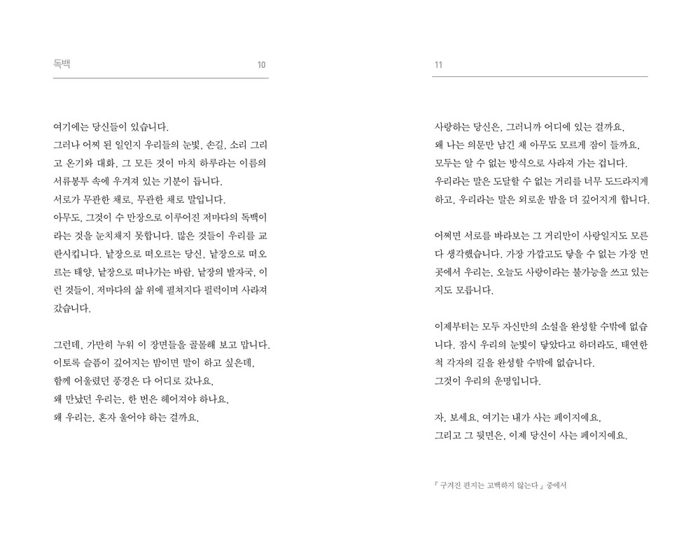 누군가를 만나 사랑하기 전에, 우리는 먼저 이별을 배워야 한다고생각했습니다. 지난 시간을 되감아가며 상처를 하나 둘씩 꺼내어봅니다. 사랑이 극복되기 위해서는 그것들을 낱낱이 바라봐야 했어요. 제가 지닌 칼날을 자세히 바라봐야 했어요. 그것이 무엇을향하는지도 주시해야 했어요. 이 책은 사랑 이전의 이별과 아픔,감정을 담은 이야기입니다. 이별을 하게 된 시간들을 되돌려 저는거기서, 그 불안 심리 속에서, 온전히 마주한 혼자된 고독의 시간속에서 진정 사랑이 무엇인지 발견해 나갑니다.