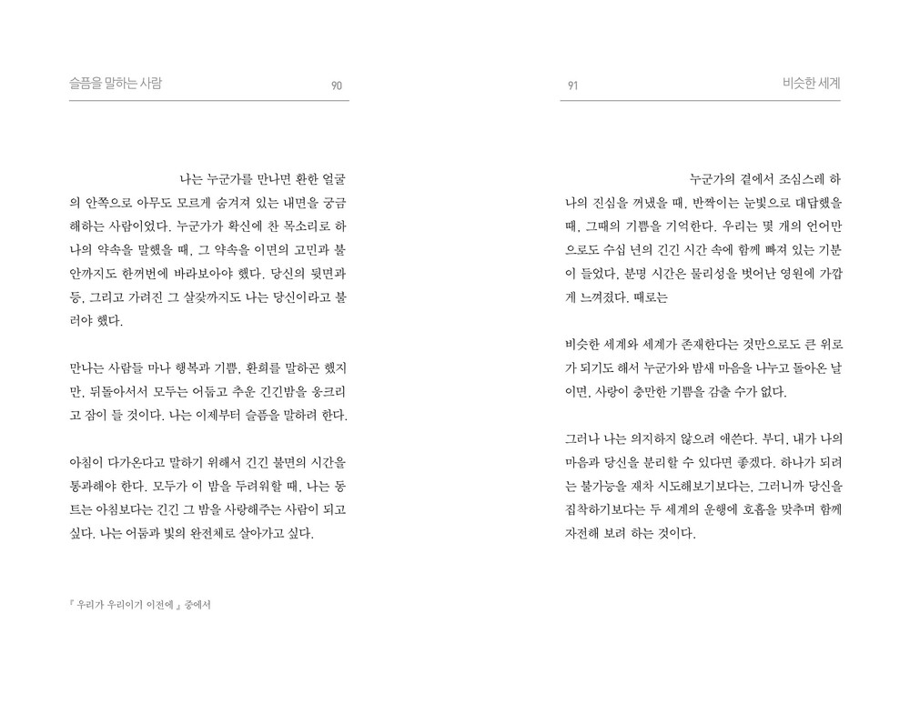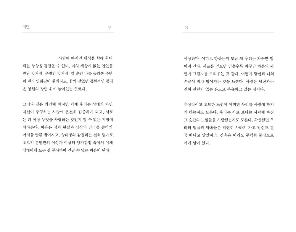 사랑 이전의 이별과 아픔, 감정을 담은 이야기입니다. 이별을 하게 된 시간들을 되돌려 저는 거기서, 그 불안 심리 속에서, 온전히마주한 혼자된 고독의 시간 속에서 진정 사랑이 무엇인지 발견합니다.