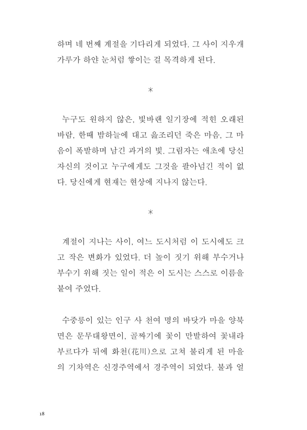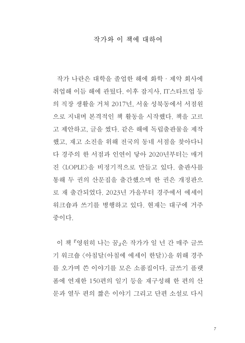 이 책 <<영원히 나는 꿈>>은 작가가 일 년 간 매주 글쓰기 워크숍 <아침달(아침에 에세이 한달)>을 위해 경주를 오가면 쓴 이야기를 모은 소품집이다. 글쓰기 플랫폼에 연재한 150편의 일기 등을 재구성해 한 편의 산문과 열두 편의 짧은 이야기 그리고 단편 소설로 다시 썼다.