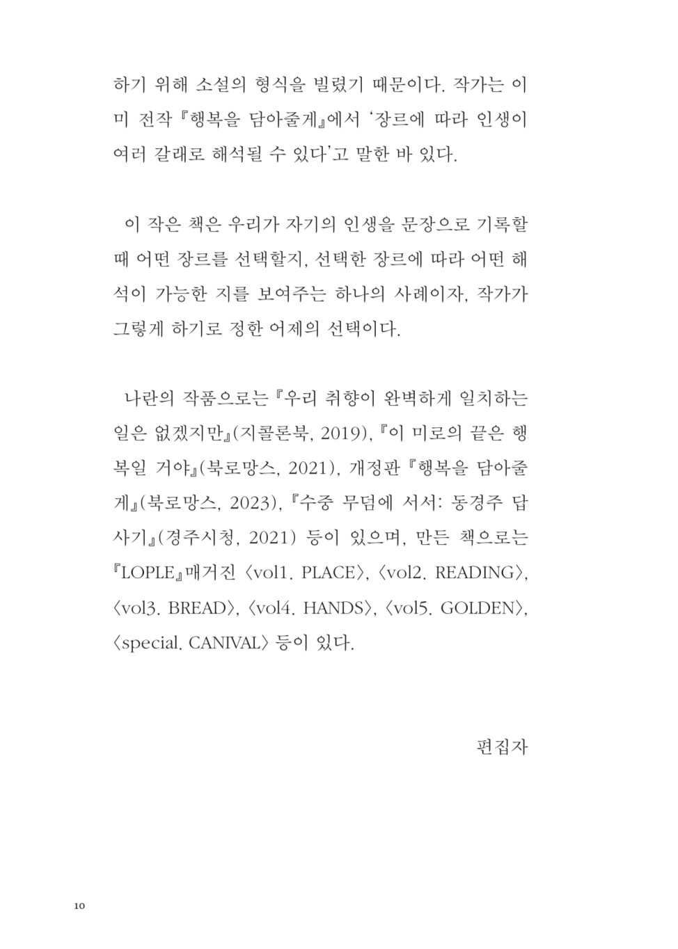 작가 나란은 대학을 졸압한 해에 화학/제약 회사에 취업해 이듬 해에 관뒀다. 이후 잡지사, IT스타트업 등의 직장 생활을 거쳐 2017년, 서울 성북동에서 서점원으로 지내며 본격적인 책 활동을 시작했다. 책을 고르고 제안하고, 글을 썼다. 같은 해에 독립출판물을 제작했고, 재고 소진을 위해 전국의 동네 서점을 찾아다니다 경주의 한 서점과 인연이 닿아 2020년부터는 매거진 <LOPLE>을 비정기적으로 만들고 있다. 출판사를 통해 두 권의 산문집을 출간했으며 한 권은 개정판으로 재 출간되었다. 2023년 가을부터 경주에서 에세이 워크숍과 쓰기를 병행하고 있다. 현재는 대구에 거주 중이다.